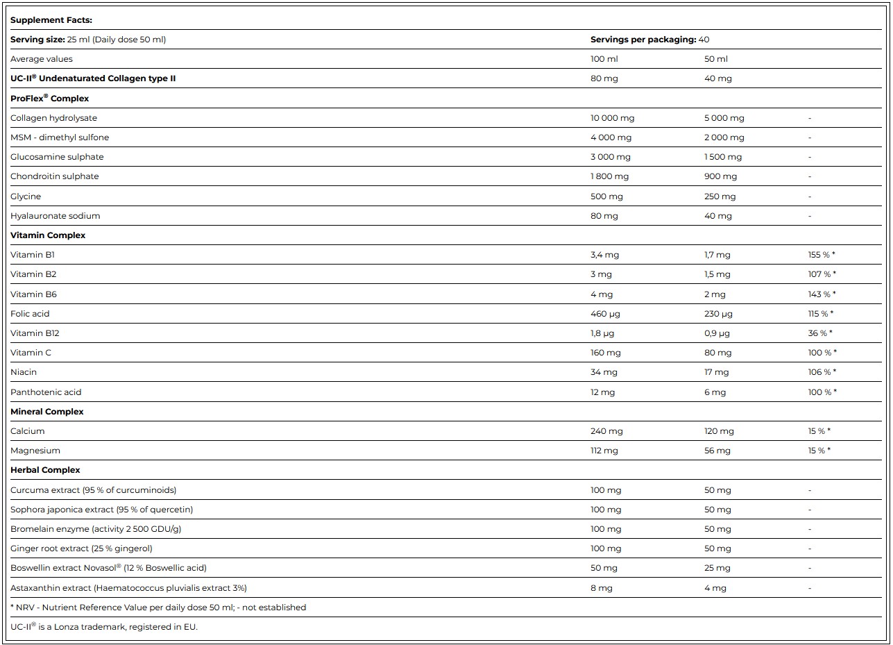 PROFLEX® COLLAGEN UC-II® je premium dodatak prehrani u tekućem obliku, osmišljen za sve koji žele aktivno brinuti o svojim hrskavicama, kostima i normalnom stvaranju kolagena. Zahvaljujući naprednoj formuli, ovaj koncentrat pruža snažnu kombinaciju kolagena, vitamina, minerala i biljnih ekstrakata u jednom praktičnom napitku.